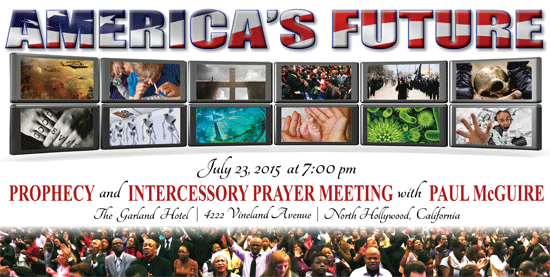 On Thursday, July 23rd at 7:00 pm Paul McGuire will hold a Free “AMERICA’S FUTURE Prophecy and Intercessory Prayer Meeting” at The Garland Hotel (formerly The Beverly Garland Hotel) in North Hollywood, California. Parking is free*, but you must register early to reserve seats for you, your family, friends, and church members.